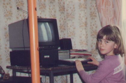 Для наших компьютеров мы с Пашкой сделали дюралевые корпуса. Внутри - плата БКашки, блок питания, контроллеры дисковода и винчестера, сам винчестер на 40 Мбайт, музыкальный сопроцессор+динамик+выход на внешние колонки. Сверху на системном блоке цветной монитор "Электроника МС..не помню какой номер.." - один из лучших отечественных (у меня он прекрасно работал и в черно-белом режиме высокого разрешения, и в цветном). На передней панели виден дисковод Teac 800K, вместо второго дисковода заглушка с лампочкой винчестера. Три кнопки слева - "Сеть", "Reset" и громкость внутреннего динамика. Справа под стопкой тетрадок, распечаток, дискет - принтер D100M, на принтере колонка (вторая в кадр не попала). Сверху на мониторе - гарнитура телефона/модема (виден микрофон и оголовье, наушник закрыт трубой).